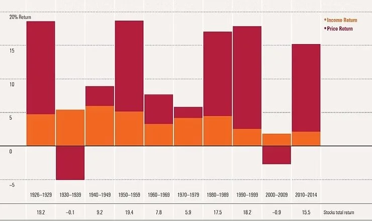 Stock Market Total Return by from Income and Appreciation by Decade