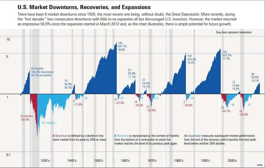 As the secular bull market that began in March of 2009 is starting to get a little age on it, naturally our phones are starting to ring a little bit (not a lot) with questions about how much life we think this bull market has left in it. It seems as though it's human nature for investors to be conditioned to expect a repeat of what just happened. We mortals tend to find ourselves fighting the last war as opposed to focusing on the future. In the late 1990's during the tech boom, most people thought the party would never end. In 2009 it seemed as though the world was headed for the next Great Depression. Fear and greed tend to drive investor behavior more so than rational analysis.