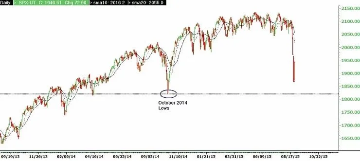 Conclusion: It is important to note that the recent low in the S&P 500 is about 2% above the lows of last October. So while the markets are extremely oversold as of this writing, reaching the October 2014 lows is a real possibility. In the near term I expect some 'panic buying' as investors' moods change from fear of losing money to fear of missing the opportunity to buy. I do not think the initial bounce will be the real move because typically market breaks like this one take a while to repair themselves. So there should be multiple opportunities to buy stocks as the market forms a base from its ultimate lows. Traders and investors can use market strength to sell laggards and raise cash. Long term investors who can handle the volatility should use the overall weakness as an opportunity to selectively add to high quality names over the coming weeks or at least maintain their positions as long as the fundamentals are sound. Aggressive types need to wait for the market to prove itself before committing serious capital. Keep in mind that the historically seasonally weak months of September and the first half of October are just around the corner. We advise clients to play the odds and use this to their advantage.