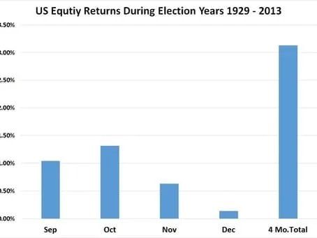 Having said this, I did a study to see how the stock market has performed for the two months leading up to and past the election for all election years going back to 1929. The results were fairly surprising to me. There were twenty-two elections. The average return not counting dividends for the four months during those twenty-two years was 3.13% with a standard deviation of 11.12%. In English this means that that returns averaged 3.13% and about two thirds of the time the range during those months was constrained between a minus 7.99% and positive 14.25% plus dividends. Surprisingly September and October (1.04% and 1.32%) had better average positive price changes than November and December (0.63% and 0.14%). I say surprisingly because September and October are infamous for being seasonally weak while November and December are typically stronger months.