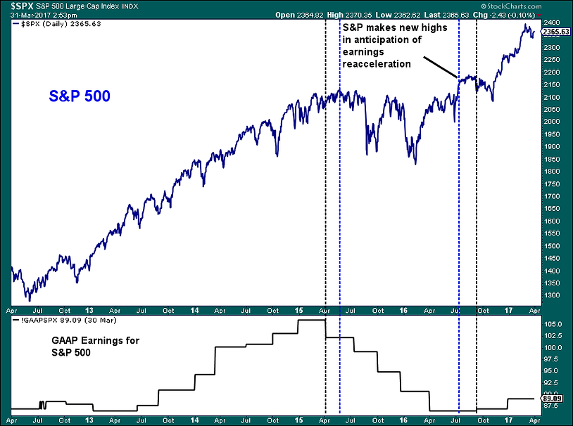 The 1st quarter of 2017 started out optimistically on the part of investors as the surprise “Trump Rally” paused and then resumed in hopes of (on the part of the stock market) deregulation and tax cuts. After a nice run, the S&P 500 peaked on March 1 and drifted lower into the end of the first quarter. Much of the blame for lower prices in March was placed on the inability of the Trump Administration to repeal and replace the Affordable Care Act. But we aren’t buying that. While it is true that hopes of a pro-growth legislative agenda probably sparked the rally, we do not think the rally was just a “Trump Rally”. We think that the reason the stock market continued its rally for more than a few weeks is because investors had (correctly) been anticipating the end of the earnings recession. We have written extensively that while the US economy never entered into a new recession, corporate earnings did. The S&P 500 peaked on May 21, 2015 at 2134.28. The index did not see that level again until July 11, 2016. The breakout in stocks that ended the volatile 14 month trading range occurred well before the election. Starting with the 1st quarter of 2015 (earnings for most companies would have been released in the 2nd quarter) GAAP earnings for the S&P 500 went on a six quarter streak of negative growth. We think that this rally has in large part been the result of earnings re-accelerating as the Fed driven market morphed into an earnings driven market. That re-acceleration started before the election.