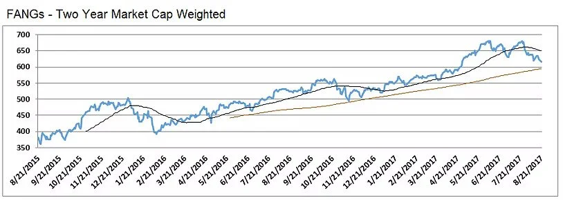 According to Bespoke Institutional, stocks broke a 58 day streak of trading without a market move of over plus or minus 1% on August 10th. Since then stock market volatility has picked up some but not dramatically. Volatility can be a good thing for alert investors looking for attractive entry points to buy stocks on sale. Below is a market cap weighted chart of Facebook, Amazon.com, Netflix and Google, also known as the FANGs. The chart shows that while the group is up dramatically, price action stalled in the early summer and has pulled back some since then. Furthermore, the months of August and September have historically been tough months for stocks. While we don't think that the group or the market is quite through running its corrective course we do think that astute investors might want to keep an eye on the group for a potential bottom in the coming months to accumulate or add to their favorite names. But make sure you do your homework and know what you own or consult with your financial adviser. And don't forget the cardinal rule of speculation - always use a stop to control your risk.