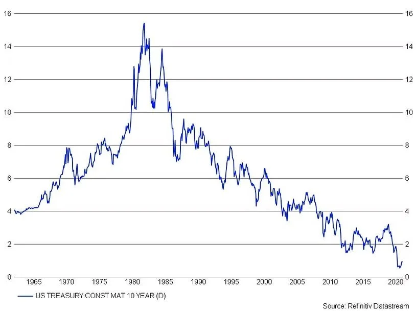 In the short term there are uncertainties and opportunities associated with the obvious events making news - social unrest, a new presidential administration and the reopening of the global economy post pandemic. But there is a larger change at play that I think is starting to emerge and it shouldn’t be ignored. In 1981 the yield on the 10-year treasury bond peaked at around 15.5% after rising since 1950. Since the early 1980’s interest rates have been falling until 2012 when rates seemed to find a floor at just below 1.50%. When the pandemic hit our shores in March of last year the US benchmark bond traded to a mind-numbing low yield of 0.39%. I think that the March low will prove to be THE low for interest rates. While interest rates can actually go negative, members of the Fed have publicly stated their belief that a negative interest rate environment is not in the best interest of the economy. The unprecedented fiscal and monetary stimulus should be the catalyst that reflates the economy and causes the interest rate tide to turn for the first time in forty years.