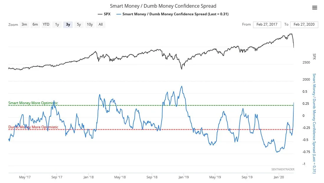 The chart above plots the sentiment of the general public (red Line) against the sentiment of the professional investor (blue line). The line at the top is the S&P 500 and the time frame is the trailing three years. What should be obvious is that main street has been generally hopeful at market tops and fearful at market bottoms while the opposite has been true for professionals. The chart below shows the spread between the two readings plotted above and a quick glance at the chart should show that the indicator has been quite reliable. While we don’t think sentiment has completely washed this market out yet, we do think we are getting close. If you have any questions about your portfolio or if you want to discuss strategies to take advantage of what we see as a setup for a wonderful buying opportunity, please call or email us.