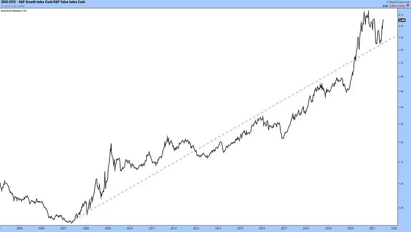Chart of the S&P Growth Index divided by the S&P Value Index. A rising line indicates that growth stocks are outperforming value stocks while a falling line indicates that value stocks are outperforming growth stocks. The trend since 2007 has generally favored growth over value but that could be about to change.