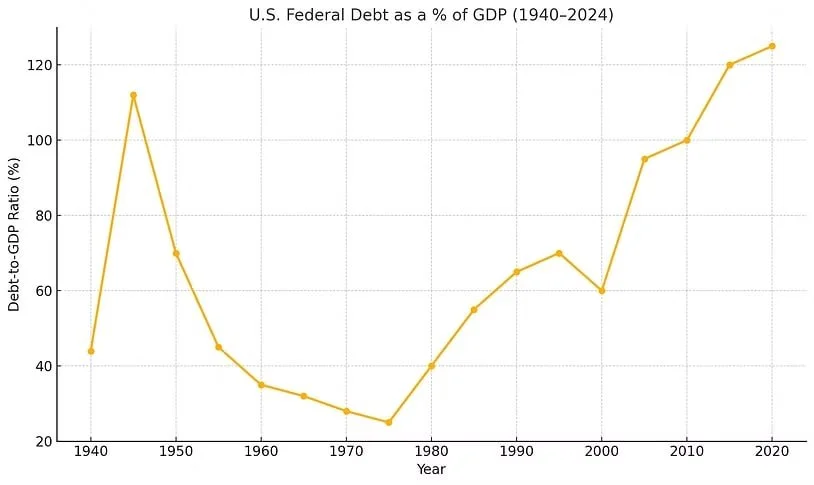Until recently, the highest level of U.S. debt relative to the size of the economy was just after World War II. In 1946, it stood at about 112% of GDP. Yet within a generation, we had cut that figure by more than three-quarters. The country didn’t do it through painful austerity or massive paydowns. We grew our way out of it. The post-war economy expanded, inflation helped erode the real value of what we owed, and government budgets, while not perfect, were relatively restrained. By the mid-1970s, debt had fallen to less than 25% of GDP.