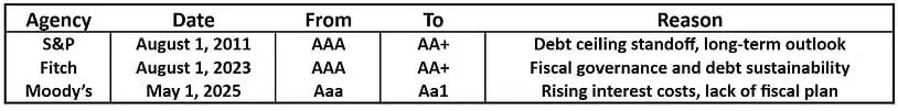 In 2023, Fitch Ratings downgraded U.S. government debt from AAA to AA+, citing long-term fiscal concerns. That came more than a decade after S&P made a similar move during the 2011 debt ceiling standoff. And most recently, Moody’s followed suit. For the first time in history, all three major credit rating agencies have placed U.S. debt one notch below perfect.