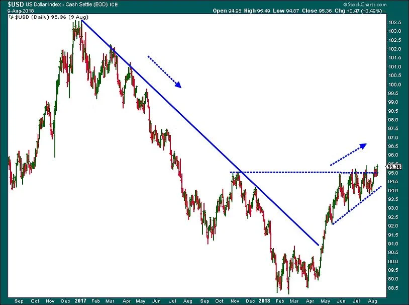 After sliding about 13% during calendar year 2017, the US Dollar seems to have broken its downtrend and it appears to want to move higher.